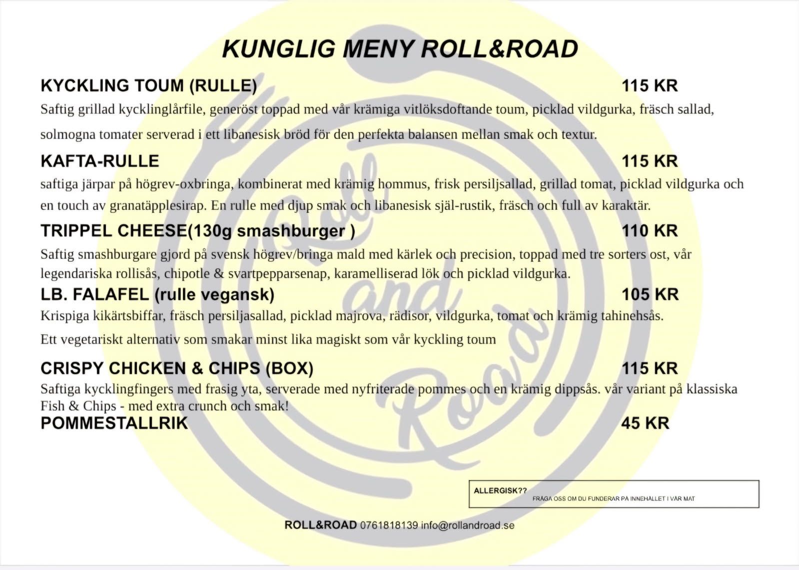 Mat: Det kommer finnas en foodtruck Roll&Road ståendes bredvid målgången där alla tävlande får 15% på menyn. Ni behöver bara uppge att ni har tävlat. Se menyn längre ned i dokumentet